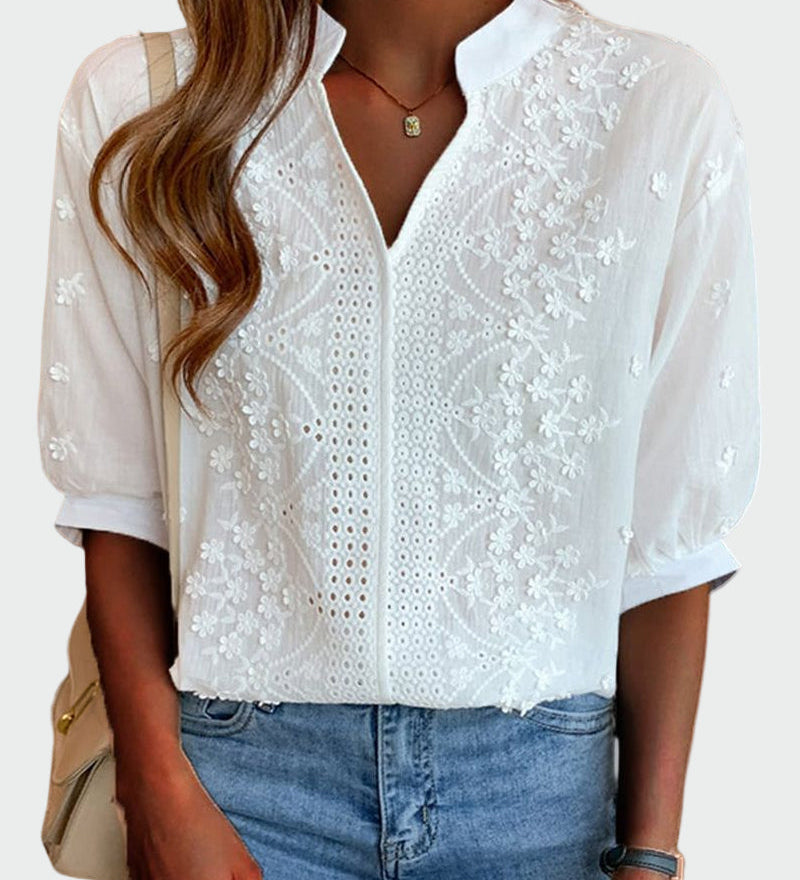 Csipkés részletekkel ellátott blúz puffos ujjakkal